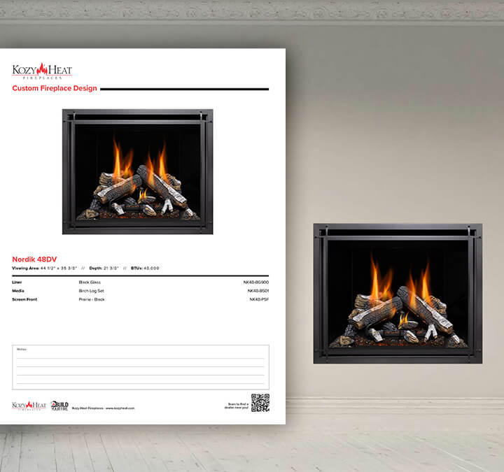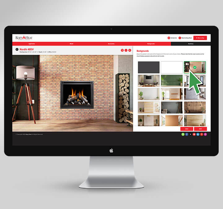 Once complete, they select a room scene to see it in context and export a custom PDF to share with any Kozy Heat dealer.